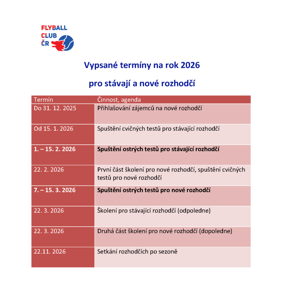 Žádáme všechny zájemce, kteří se chtějí stát flyballovým rozhodčím, aby se přihlásili výboru ideálně do 31. 12. 2025. Optimálně na email Zuzce Pecháčkové (zpechackova7@gmail.com). Podle počtu adeptů a míst odkud jsou, bude následně vybráno i místo úvodního školení.